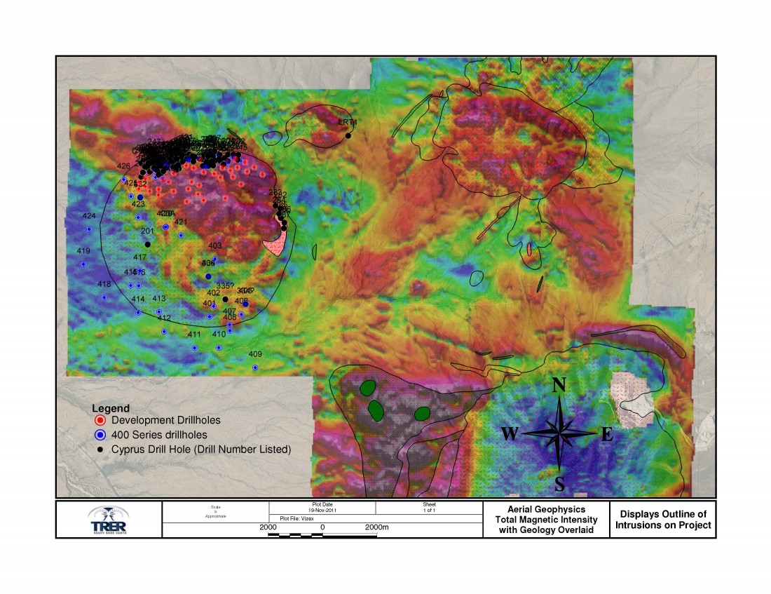 In May 2011, an airborne magnetic survey was flown over the project area. This survey was conducted to identify future drill targets, assist with the present drilling program, and determine the location of the feeder neck for the Round Top intrusion.